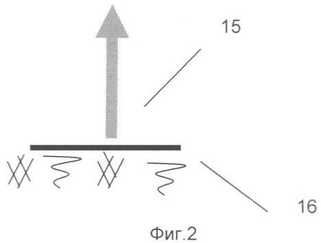 На фиг.2 изображены: 15 – поток энергии ЕБК(1) в бурильной колонне 3 (без учета энергии ЕБН, генерируемой буровым насосом 11, т.е. звуковые волны подавлены режекторным фильтром 14 в полосе частот [f(i)-f(i+n)]П (индекс П в [f(i)-f(i+n)]П означает помеху в частотном спектре f(l)-f(m) бурового насоса) звуковых волн, бегущих по бурильной колонне 3 от турбобура 2 к устью скважины при отсутствии нагрузки на долото 1; 16 – горная порода.