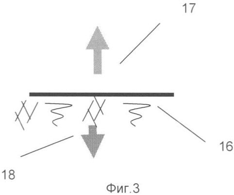 На фиг.3 изображены: 16 – горная порода; 17 – поток энергии ЕБК (2) с нагрузкой на долото 1 (без учета энергии бурового насоса ЕБН, генерируемой буровым насосом 11, т.е. звуковые волны подавлены режекторным фильтром 14 в полосе частот [f(i)-f(i+n)]П в частотном спектре f(l)-f(m) бурового насоса) звуковых волн, бегущих по бурильной колонне 3 от турбобура 2 и долота 1 к устью скважины при нагрузке на долото G(1), 18 – поток энергии ЕГП звуковых волн, поглощаемых горной породой 16 при ее разрушении, при нагрузке на долото G(1).