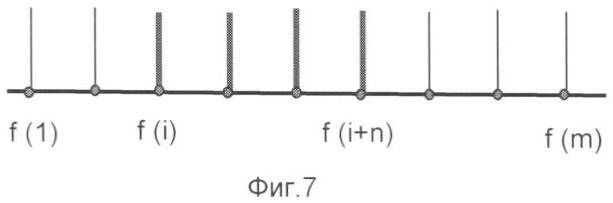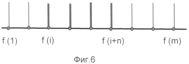 На фиг.6 изображен частотный спектр звуковых волн в диапазоне частот [f(l)-f(m)]ТБ, генерируемых в бурильную колонну 3 турбобуром 2 (индекс ТБ в [f(i)-f(i+n)]ТБ означает – спектр турбобура). Полоса частот [f(i)-f(i-n)]И равна полосе частот [f(i)-f(i+n)]ТБ (индекс И в [f(i)-f(i+n)]П означает информационная) в частотном спектре [f(l)-f(m)]ТБ, генерируемого турбобуром 2, является информационной частотой, показывающая отсутствие нагрузки на долото 1 (долото оторвано от забоя скважины).