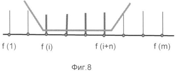 На фиг.8 изображен частотный спектр звуковых волн в диапазоне частот [f(l)-f(m)]ТиД ((индекс ТиД в [f(i)-f(i+n)]ТиД означает спектр генерируемый турбобуром и долотом)), генерируемых долотом 1 и турбобуром 2. Полоса частот [f(i)-а(1+n)]И в частотном спектре [f(l)-f(m)]]ТиД, генерируемого долотом и турбобуром, является информационной частотой, показывающая и нагрузку на долото 1 и работу турбобура 2. (нагрузка задана согласно геолого-технологическму наряду (ГТН)).