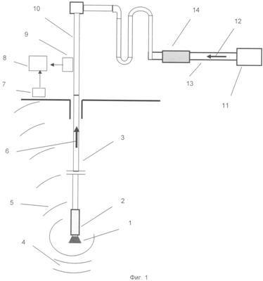 На фиг.1 изображено: 1 – долото, 2 – турбобур, 3 – бурильная колонна, 4 – звуковые волны, генерируемые долотом 1 и поглощаемые горной породой, 5 – звуковые волны, распространяющиеся от долота 1 к устью скважины по горной породе, 6 – звуковые волны, распространяющиеся по жидкости в бурильной колонне 3 от турбобура 1, 7 – датчик, регистрирующий звуковые волны 5, распространяющиеся по горной породе от долота 1, 8 -измерительный комплекс, 9 – датчик, регистрирующий звуковые волны с ведущей трубы 10, 11 – буровой насос, 12 – звуковые волны, генерируемые буровым насосом 11 в нагнетательную линию 13, 14 – акустический режекторный фильтр. Датчики 7 и 9 входят в наземный измерительный комплекс 8.