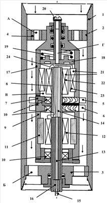 Для заправки полости генератора смазывающей жидкостью служит отверстие «Г», выполненное в статоре 17. Во внутренней полости статора 17 установлен поршень 18, подпружиненный пружиной 19. Отверстие «Г» заглушено винтом 20. В верхней части устройства размещено устройство бесконтактной передачи электроэнергии 21, которое содержит первичную обмотку 22, установленную на пустотелом валу 8, и вторичную обмотку 23, выполненную внутри статора 17. Промежуточные провода 24 соединяют первичную обмотку 22 и обмотку возбуждения 12 для передачи электроэнергии с обмотки возбуждения к обмотке устройства бесконтактной передачи электроэнергии. Электрические провода 14 соединяют вторичную обмотку 23 с электрическим разъемом 15.