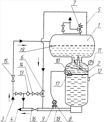 Затем снова ставят переключатель потока 6 в положение “продувка”, при котором газопровод 5 соединен с коллектором 4, а сливная жидкостная линия 18 перекрыта. При этом происходит вытеснение жидкости из измерительной емкости 2, скорость которого определяют по времени получения сигналов от соответственно верхнего 10 и нижнего 9 датчиков указателя гидростатического давления 8. Снова измеряют избыточное давление и температуру.
