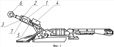 Изобретение поясняется чертежами, где на фиг.1 изображен вид сверху на проходческий комбайн с установленной системой, а на фиг.2 показан вид сбоку.