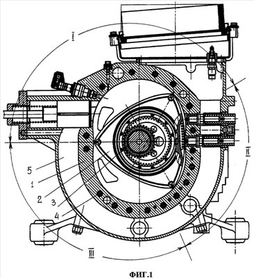 Третье отличие от прототипа заключается в том, что с целью уменьшения деформации статора и крышек статора от действий термических нагрузок, возникающих от неравномерного поля температур по всему внутреннему контуру статора, охлаждающая жидкость подается в горячие зоны II и III, фиг.1, статора параллельными каналами, формирующими теплосъем, больший там, где выше температура внутреннего контура статора.
