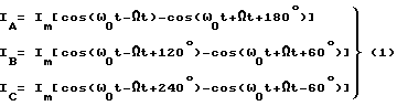 Синхронизатор 1 формирует в пункте передачи импульсы в единые моменты времени перехода питающего напряжения U(t) частоты F через ноль. Начало и конец передачи сигнала совпадают с едиными моментами времени перехода питающего напряжения U(t) частоты F через ноль в пунктах передачи и приема. При работе передатчика 2 в его фазных проводах A, B, C образуют следующие токи сигналов по аналогии с прототипом мгновенные значения которых описывают выражениями:![]() где Im – амплитудное значение токов на частотах 1 и 2, 1= ( 0– ) и 2= ( 0+ ); 0= 2 f0; = 2 F; f1=f0-F; f2=f0+F; f0 – частота запуска передатчика.