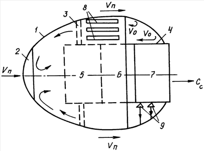 Предложенный способ можно реализовать, например, с помощью устройства, схема которого представлена на чертеже. Устройство для создания движущей силы транспортного средства, перемещающегося, например, в воздушной среде, содержит обечайку (1) с клапаном (2) и с пилонами (3) для крепления обечайки к кожуху (4) движителя. Внутри кожуха движителя расположены традиционные системы забора (5), ускорения (6) и выброса (7) рабочего тела. Набор элементов (4-7) зависит от тягово-скоростных характеристик транспортного средства и конкретных свойств среды, в которой оно перемещается. Осуществление способа проиллюстрируем на примере работы устройства. При движении транспортного средства (в рассматриваемом случае летательного аппарата) обечайка движителя обтекается воздушным потоком, имеющим скорость Vп. За кормой обечайки образуется застойная зона с обратными токами. Эксперименты различных авторов показывают, что скорость возвратного течения Vо увеличивается с ростом скорости Vп набегающего потока и может составлять 20-50% от скорости этого потока [3, 4]. Итак, вместо потока со скоростью Vп, натекающего в систему забора рабочего тела традиционных движителей без обечайки, в предлагаемом варианте на входе в кормовую часть обечайки имеется поток со скоростью Yо, совпадающий с направлением перемещения транспортного средства. В носовой части обечайки происходит разворот потока на 180°. При необходимости увеличения массы рабочего тела срабатывает клапан (2), и рабочее тело начинает поступать внутрь обечайки и далее в заборник с обоих направлений. Причем высоконапорный поток, проходящий через клапан (2) со скоростью Vп, будет эжектировать низконапорный газ, втекающий из кормы обечайки со скоростью Vо. Далее процессы ускорения и выброса рабочего тела происходят одинаково как в традиционном движителе, так и в предлагаемом.