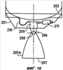 На фиг.9 одновременно можно видеть юбку 203, закрывающую пространство между ступенями, и юбку (станину) 201, которая передает на верхнюю ступень 202 5 ракеты-носителя тяговое усилие от двигателя 205, когда он развернут в рабочее положение.