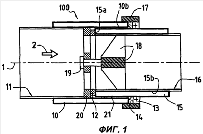 В примере, показанном на фиг.1, участок 11 представляет собой передний (верхний по направлению потока) участок, а участок 16 – задний (нижний по направлению потока) участок. Однако в других вариантах выполнения направление движения жидкости может быть противоположным относительно стрелки 2.