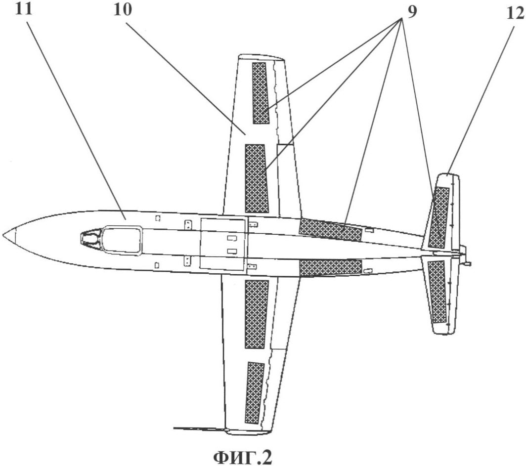 Для самолета классической аэродинамической компоновки, с целью обеспечения его экономичного движения по заданной траектории и управления, а также балансировки на заданном режиме полета, секции размещают на консолях крыла (10), фюзеляже (11) и горизонтальном оперении (12).