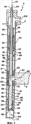 На Фиг.1-4 изображен комплект 2 забойного насоса, расположенный ниже поверхности 4 земли и имеющий жидкостное сообщение с рабочей зоной 6 жидкости 30. Термин “жидкость” следует толковать широко в значении любой жидкости, включая нефть или воду. Комплект забойного насоса включает эксплуатационную насосно-компрессорную колонну 8 и насос 10, расположенные внутри эксплуатационной колонны. Насос 10 включает цилиндр 12, образующий насосную камеру 14, и плунжер 16, расположенный подвижно в насосной камере 14. Как цилиндр 12, так и насосная камера 14 имеют первый и второй концы – 18, 20, 22, 24 с первым проточным клапаном 26, соединенным с первым концом 18 цилиндра, находящимся около первого конца 22 насосной камеры, и со вторым проточным клапаном 28, соединенным со вторым концом 20 цилиндра, находящимся около второго конца 24 насосной камеры.