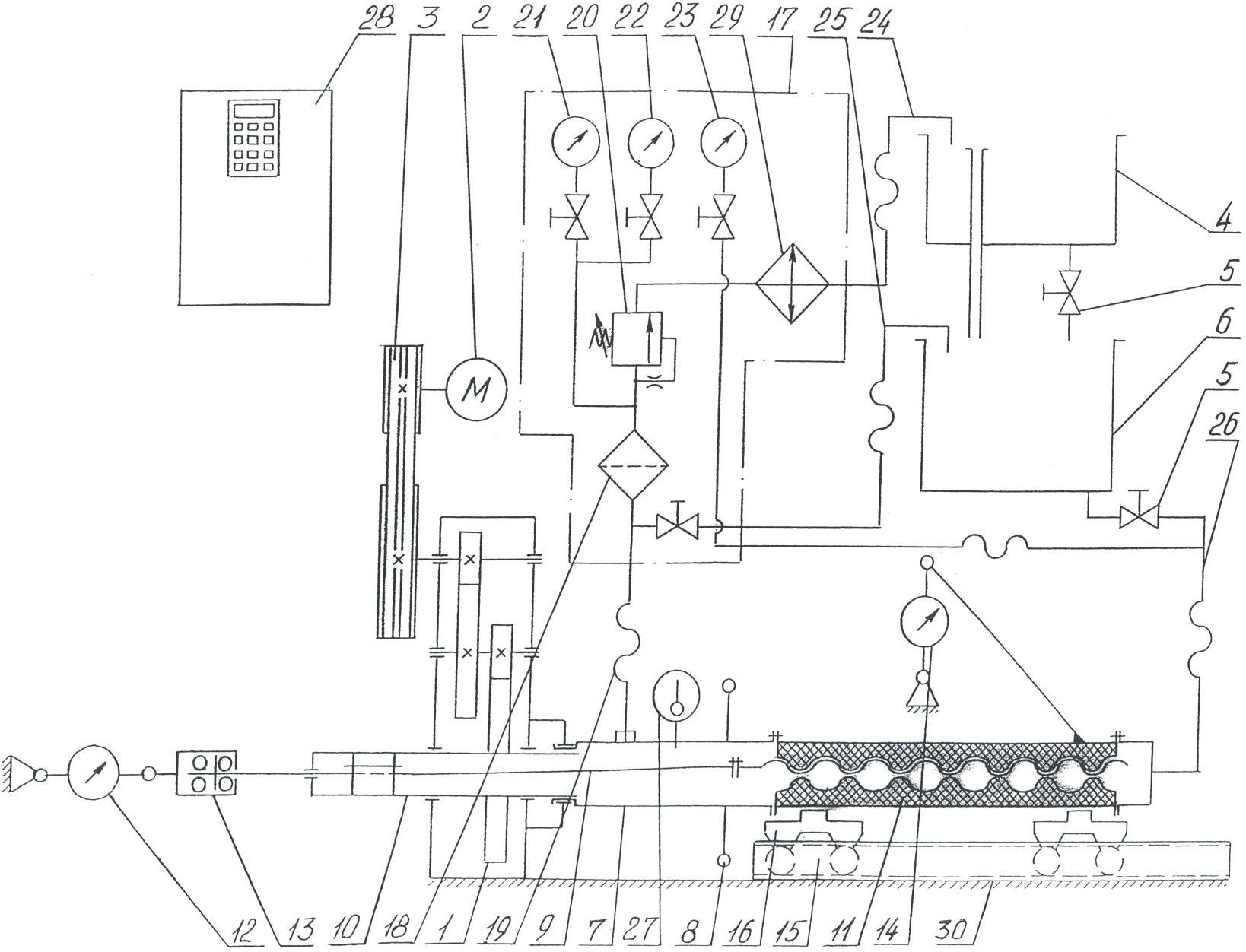 На чертеже изображен стенд для испытаний винтовых насосов. Стенд содержит: редуктор 1 с приводом от электродвигателя 2 через клиноременную передачу 3, гидравлическую систему, выполненную в виде мерной емкости 4, позволяющей замерять расход жидкости, со сливным краном 5, основной емкости 6 со сливным краном 5 для гидравлической жидкости, корпуса напорной части 7 со штурвалом 8 с возможностью вращения относительно корпуса редуктора 1 для сборки и разборки насоса 11, гибкий вал 9, имеющий возможность осевого перемещения и передающий крутящий момент от полого вала 10 к винту испытуемого насоса 11, динамометр 12 с корпусом подшипников 13 для замера осевого усилия на винте насоса, динамометр 14 для замера реактивного момента на корпусе обоймы винтового насоса 11, направляющие 15, на которых размещены стойки 16 с возможностью осевого перемещения, систему измерения и регистрации параметров насоса 17, включающую фильтр 18, напорный рукав 19, регулятор давления 20, манометры 21, 22, вакуумметр 23, линию замера 24, стравливающую линию 25, подводящий рукав 26. На выходе из насоса внутри корпуса напорной части 7 установлен датчик температуры 27, для определения температуры жидкости и соответственно нагрева резиновой обкладки статора. Система управления стендом 28 с тиристорным преобразователем частоты, управляющая двигателем, позволяет менять режимы испытания насосов. Гидравлическая система снабжена устройством 29 для охлаждения рабочей жидкости, что исключает ее перегрев, а следовательно, это не будет сказываться на показаниях замеров параметров насоса. Стойки 16 с помощью зажимов типа призмы, которые имеют регулировку по высоте для установки насосов различного диаметра, автоматически обеспечивают соосность насоса относительно выходного вала редуктора. На раме 30 крепятся все элементы стенда. Стенд работает следующим образом. Производится монтаж насоса на стенде, причем обойма насоса 11 жестко крепится с корпусом напорной части 7 гидравлической системы при помощи штурвала 8, к ней кинематически крепится динамометр 14 и устанавливается на стойках 16, имеющих возможность осевого перемещения, а винт насоса 11 соединяется с гибким валом 9, передающим вращение и связанным с корпусом подшипников 13 и динамометром 12. Из емкости 6 на вход испытуемого насоса 11 подается жидкость, в качестве которой используется вода, масло, нефть и ее составляющие. В системе управления стендом 28 задается требуемая частота вращения электродвигателя 2, производится пуск стенда и регулятором давления 20 устанавливается необходимое давление испытаний. Производительность насоса замеряется в мерной емкости 4 объемным способом.