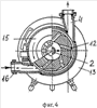 Насос состоит (фиг.3, 4) из ротора 11 с радиальными каналами или лопастями 12, установленного внутри полого статора 14 на валу электродвигателя 13, крышки 15 с центральным входным каналом 2, дополнительным входным каналом 16, расположенным тангенциально к статору 14, и выполненным сужающимся в направлении циркулирующего потока фильтруемой жидкости, а также отводным каналом 4, расширяющимся по ходу течения.