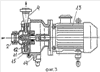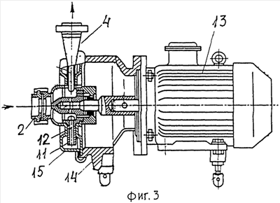 Наиболее близким по технической сущности и достигаемому результату является центробежный насос типа 50-1Ц7 Московского завода молочного оборудования (фиг.2), используемый в аппаратах для тангенциальной микро- и ультрафильтрации, состоящий из ротора 11 с радиальными каналами 12 или лопастями, вращающегося на валу электродвигателя 13 в неподвижном цилиндрическом полом статоре 14, закрытом крышкой 15, имеющей осевой входной канал 2 и тангенциально к статору расположенный расширяющийся отводной канал 4 (Оборудование технологическое для молочной промышленности. Отраслевой каталог. ЦНИИТЭИ. Москва, Легпищемаш, 1984, Центробежный насос типа 50-1Ц7).