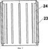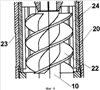 Далее смесь поступает по линии 19 в диспергатор 20. В нем благодаря указанным выше отличительным признакам изобретения (диспергатор 20 состоит из расположенного на валу 10 шнека 22 и неподвижной обечайки 23 с внутренними ребрами 24, охватывающей шнек 22 снаружи, причем внутренние ребра 24 обечайки 23 параллельны оси шнека 22) происходит интенсивное эффективное диспергирование газожидкостной смеси, причем на выходе из диспергатора 20 поток проходит через решетку 29 с наклонными ребрами 30, где давление смеси повышается. В погружной насос 3 поступает смесь с повышенным давлением и мелкими пузырьками, равномерно распределенными в жидкости, и газ не оказывает вредного влияния на работу насоса 3, который эффективно нагнетает смесь по трубам 7 на поверхность.