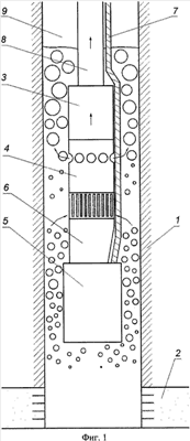 Продукция нефтяного пласта 2 поступает в скважину 1. По мере подъема продукции по стволу скважины 1 вверх давление в потоке падает, и при давлениях, меньших давления насыщения, происходит выделение из нефти пузырьков свободного газа. Газожидкостная смесь подводится в газосепаратор-диспергатор 4 погружного насоса 3.