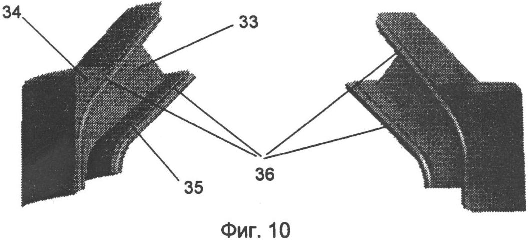 Конструкция направляющего аппарата представлена на Фиг.9. Направляющий аппарат состоит из ступицы 29, сегментов 30, наружной обоймы 31, установленной с натягом относительно сегментов 30, и внутренней вставки 32, выполняющей функцию радиального подшипника и установленной с натягом в ступице 29. Конструкция отдельного сегмента направляющего элемента представлена на Фиг.10. Сегмент состоит из лопасти 33 с прилегающими к ней бандажными полками 34 и 35. Конфигурация посадочной части поверхности 35 соответствует геометрии наружной поверхности ступицы 29. Конфигурация посадочной части бандажной полки 34 соответствует геометрии внутренней контактной части обоймы 31. Сегменты 30 и вставка 32 изготовлены из износостойкого материала с твердостью по Роквеллу А не менее 80. В качестве таких материалов можно использовать керамику в виде оксида алюминия, или диоксида циркония, или карбидные соединения металлов.
