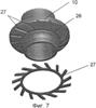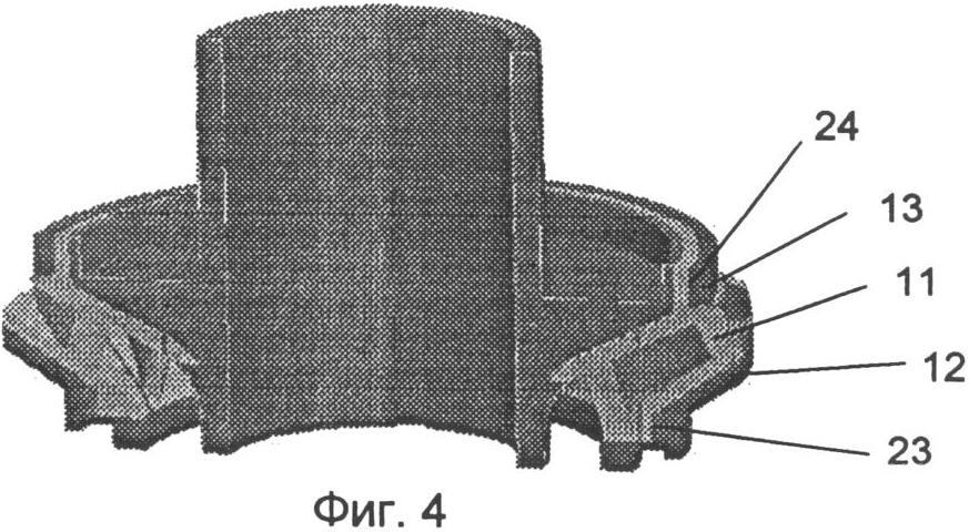 Сборку направляющего элемента осуществляют следующим образом. Вставку 32 запрессовывают в ступицу 29. Сегменты 30 устанавливают в посадочное место ступицы 29. Обойму 31 нагревают до фиксированной температуры. Температуру нагрева определяют исходя из достижения необходимой величины усилия натяга в соединении; она зависит от коэффициента теплового объемного расширения материала обоймы. После нагрева обойму 31 устанавливают поверх сегментов 30 (Фиг.9). По мере охлаждения обойма плотно обжимает сегменты и прижимает их к ступице.