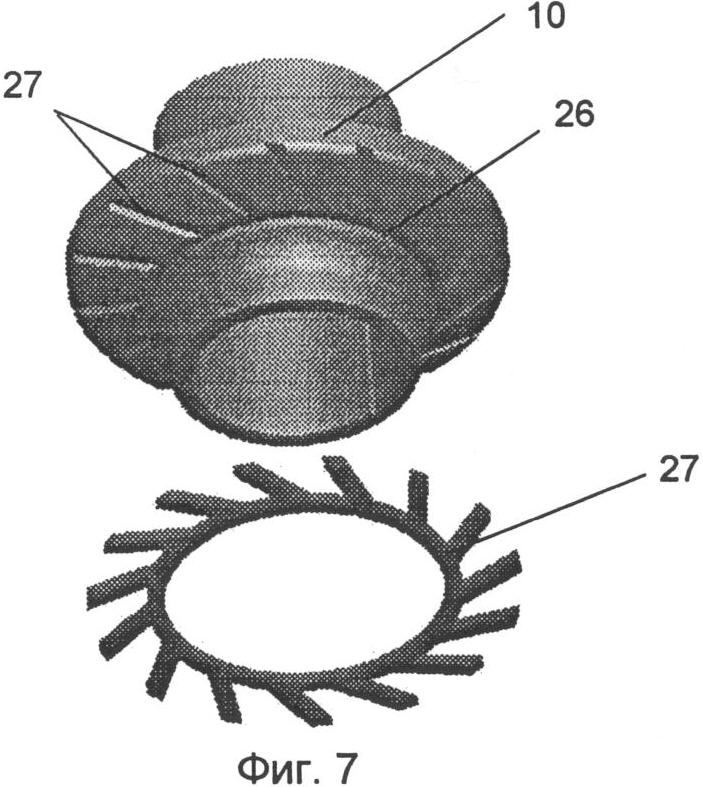 Другим предлагаемым конструктивным элементом колеса является наличие торцевого уплотнения 25 (Фиг.5 и Фиг.6) в сопряжении торцов сегментов. Торцевое уплотнение предотвращает попадание перекачиваемой жидкости с механическими примесями на поверхности ступицы и обода. Торцевое уплотнение выполнено в виде V-образного соединения выступа и соответствующей ей впадины, сформированных на торцах сегментов.