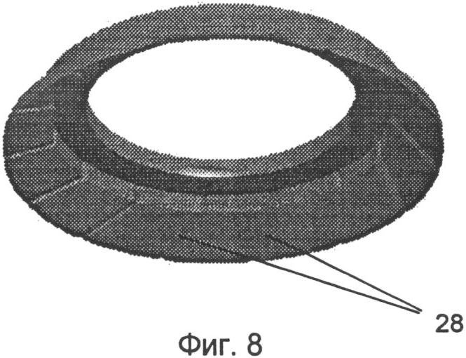 Для предотвращения перетоков прокачиваемой жидкости под сегментами предложен вариант исполнения конструкции колеса, представленный на Фиг.7. На поверхности ступицы выполняют концентричную канавку 26 с примыкающими к ней радиальными пазами 27 в количестве, равном количеству сегментов. Конструкция эластомерного уплотнения 27 представлена на Фиг.7. В связи с нагревом обода 12 в процессе сборки колеса не представляется возможным использование прокладки из эластомерного материала в месте контакта обода и сегмента. Взамен эластомерного материала для прокладки возможно использование мягкого пластичного материала, размещенного в пазах 28 на внутренней поверхности обода (Фиг.8).