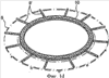 Во всех случаях выступы 9 или 9′ одного слоя могут быть соединены между собой перемычками. В случае орторадиальной структуры эти перемычки могут быть выполнены в виде колец или одного кольца 10, расположенного рядом с пластинами 8, соединяя их, как показано на фиг.1d.