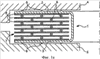 Показанная на фиг.1а прокладка имеет структуру, называемую радиальной, в которой вставки 9 являются концентричными кольцами различных радиусов. Чтобы наилучшим образом участвовать в давлении сжатия, ряды, в числе трех на фигуре, в которых вставки 9 соприкасаются с крайними пластинами 8, опирающимися своей другой стороной на опорные стороны 2 и 3, будут иметь такие же диаметры, что и выступы 6, находясь при этом под ними, а другие ряды вставок 9 будут располагаться на середине расстояния между выступами 6. Две крайние пластины 8 находятся в контакте с металлической оболочкой 1. Этот контакт представляет собой плоское и скользящее соединение.