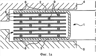 Первый вариант выполнения показан на фиг.1а; прокладка представляет собой металлическую оболочку 1, содержащую две опорные стороны 2 и 3, выполненные с возможностью обеспечения герметичности между двумя фланцами 4 и 5, причем снаружи опорных сторон 2 и 3 выполнены выступы 6, вершины которых соприкасаются с фланцами 4 и 5 с возможностью концентрирования усилия сжатия. Прокладка содержит также внутреннюю структуру 7, состоящую из нескольких гибких упругих пластин 8, опирающихся на разделяющие их промежуточные вставки 9.