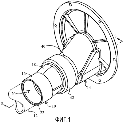 Как видно на фиг.2, 3 и 5, муфта 10 является в основном трубчатой деталью, которая имеет прямую секцию 16 и наклонную секцию 18, образующие отверстие прохода 20 у противоположных концов 22 и 24 муфты 10. Внутренний диаметр конца 22 закруглен для упрощения введения в него питающего трубопровода 12. Прямая секция 16 является цилиндрической с внутренним и наружным диаметром, оба из которых имеют постоянный радиус и расположены концентрически вокруг центральной линии 26. Прямая секция 16 переходит в наклонную секцию 18 на промежуточном внутреннем узком конце 28 наклонной секции 18, где муфта 10 определяет радиальный внутренний выступ, так что проход 20 находится в своей самой узкой точке. Оттуда муфта 10 отклоняется по направлению вверх так, чтобы широкий конец 24 смещался по оси от конца 22. Внутренняя поверхность наклонной секции 18 изменяется относительно ее наружной поверхности по мере движения от ее узкого конца 28 к широкому концу 24.