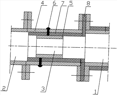 На чертеже показано устройство для защиты токоизоляционного соединения трубопроводов. Представлены: труба 1 с наружной диэлектрической изоляцией и электрохимической защитой, труба без электрической изоляции 2, многослойное токоизолирующее средство 3. Многослойное средство 3 состоит из наружного 4 и внутреннего 5 слоев, соединенных между собой жестко, например, сварочным контактом 6. Длина внутреннего слоя средства составляет 90% от длины наружного слоя. Объем между наружным и внутренним слоями заполнен диэлектрическим материалом 7, которым покрывают и оставшуюся свободную внутреннюю поверхность наружного слоя. Между фланцами многослойного средства 3 и трубы с наружной диэлектрической изоляцией 2 устанавливают кольцевой диэлектрический изолятор 8.