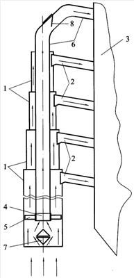 Часть пылегазового потока самой мелкой фракции попадает в цилиндрическую полую вставку 4, затем в трубопровод 6 и по нему через горелку (не показана) в восстановительную зону топочной камеры 3 с пониженным содержанием кислорода. Здесь под действием продуктов неполного сгорания часть оксидов азота (NOx) восстанавливается до безопасного атомарного азота (N2). Изменяя положение регулирующего клапана 8, устанавливают необходимый расход пыли в восстановительную зону топочной камеры 3. Этим самым регулируют распределение пылегазового потока по ярусам основных горелок (не показаны), что позволяет оптимизировать топочный процесс.