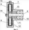 Теплогенератор 3 состоит из статора 6 с цилиндрической полостью 7, внутри которой на вале 8 жестко закреплен ротор в виде диска 9. Вал 8 установлен в подшипниковой опоре 10 и уплотнен торцевым уплотнением 11. На внутренних торцевых поверхностях статора 6, на торцевых и цилиндрической поверхности диска 9 выполнены ряды несквозных отверстий 12. На диске 9 в непосредственной близости от вала 8 выполнены сквозные отверстия 13. Входной канал 14 для подвода жидкости размещен соосно с валом 8 на торцевой поверхности статора 6. Выходной канал 15 для отвода жидкости установлен на цилиндрической поверхности статора 6.