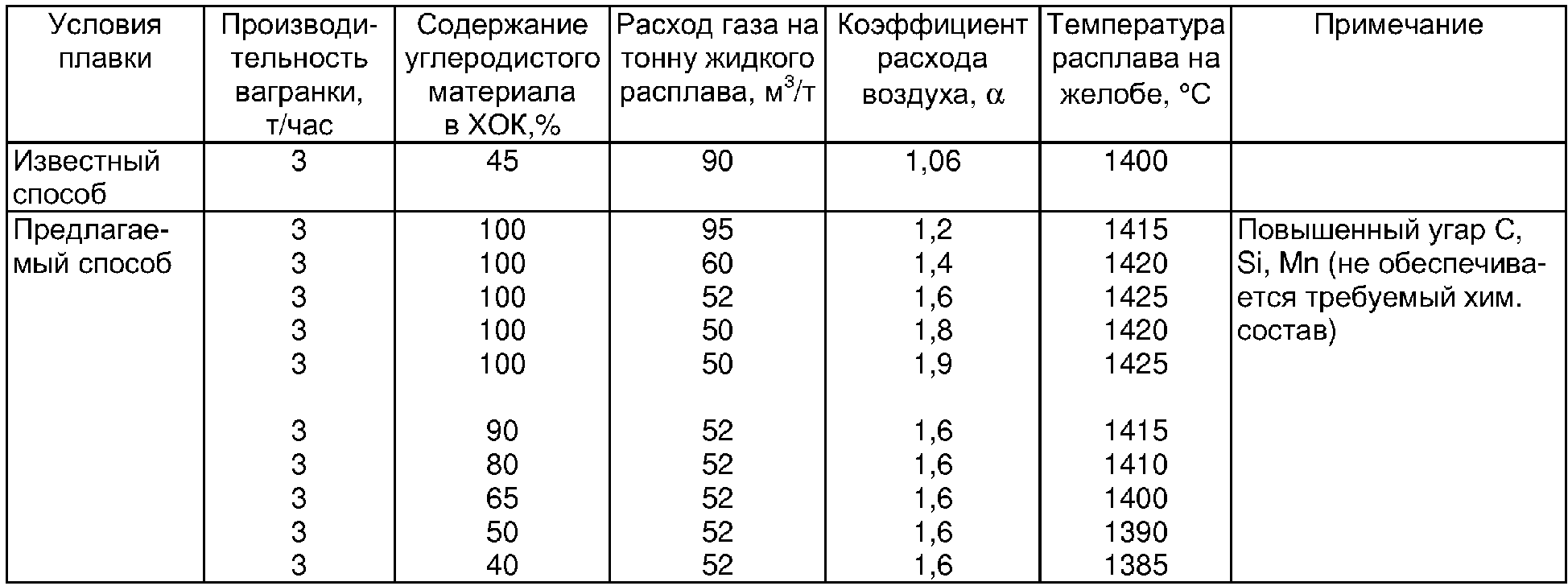 Изобретение относится к металлургии и может быть использовано в литейном производстве. При плавлении шихтовых материалов в газовой вагранке природный газ сжигают с коэффициентом расхода воздуха в пределах 1,4-1,8. Количество углеродистого материала в холостой огнеупорной колоше составляет 50-100%. При использовании изобретения обеспечивается снижение расхода природного газа. 1 табл.