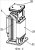Вид на фиг.2 показывает, как размещены блоки 6 в самостоятельной индукционной системе 14 и дополнительные вставки 15 относительно трубчатых стенок плавильной камеры агрегата. Отдельно блок 6 показан на фиг.4. В блоке 6 размещен индукционный модуль, включающий магнитопровод 18 с ярмом и зубцом и катушки 19 обмотки модуля. Блок 6 имеет также элементы 20, обеспечивающие подвод электропитания к катушкам обмотки модуля, и элементы 21, позволяющие осуществить на опорной металлоконструкции установку блока 6 с индукционным модулем относительно охлаждаемой стенки плавильной камеры агрегата. Самостоятельная индукционная система 14 ЭПА на опорной металлоконструкции устанавливается стационарно.