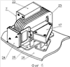 Вид на фиг.3 показывает, как размещены блоки 7 в самостоятельной индукционной системе 16 и дополнительные вставки 17 относительно днища плавильной камеры агрегата. Отдельно блок 7 показан на фиг.5. В блоке 7 размещен индукционный модуль, включающий магнитопровод 22 с ярмом и зубцом и катушки 23 обмотки модуля. Зубец магнитопровода может быть выполнен так, что он будет перекрывать часть катушек обмотки модуля (на фиг.2 и 4 зубец магнитопровода показан без перекрытия части обмотки модуля). Блок 7 имеет устройство 24, обеспечивающие подвод электропитания к катушкам обмотки модуля (см. фиг.5), и устройство 25, позволяющее устанавливать блок 7 на опорную плиту 26.