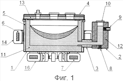Относительно днища плавильной камеры 1 размещается самостоятельная индукционная система 16 из блоков 7. В системе 16 число блоков 7, содержащих индукционные модули, также должно быть кратно трем, например, включать 12 блоков 7 (см. фиг.3).