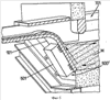 Как показано на фиг.1-3, вызывающее поток или перемешивающее устройство 500 включает электромагнитное индукционное устройство в виде в основном прямоугольного ящика 501, соединенного с наклонной концевой стенкой 502 люльки или порта 503 устройства 500, имеющей, в целом, сечение прямоугольного равнобедренного треугольника. Наклонная стенка 502 наклонена под углом 45° к вертикальной стенке 504 и горизонтальной стенке 505 люльки или порта 503.