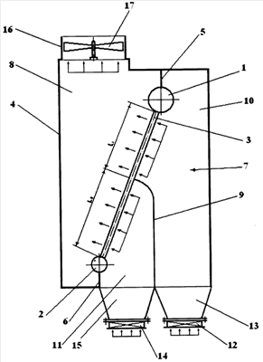 Конденсатор пара согласно изобретению работает следующим образом. Внутри труб 3 теплообменного пучка в направлении от верхнего парораспределительного коллектора 1 к нижнему коллектору 2 сбора конденсата движется пар, а охлаждающий атмосферный воздух – в межтрубном пространстве при близком к поперечному обтекании их. Пар в оребренных трубах 3 конденсируется потоком охлаждающего воздуха, а образующийся конденсат стекает за счет силы тяжести в нижний коллектор 2, откуда с помощью конденсатного насоса (на чертеже не показан) возвращается в рабочий контур соответствующей теплоэнергетической установки. Охлаждающий воздух поступает к трубам 3 под действием вытяжного вентилятора 17 по двум коробам 13 и 15, подключенным к верхнему отсеку 10 и нижнему отсеку 11 входной части 7 кожуха 4. Регулирование подачи охлаждающего воздуха в каждый из указанных отсеков осуществляют с помощью регулирующих клапанов 12 и 14. При установке напорного вентилятора перед коробами 13 и 15 регулирование подачи воздуха к верхней и нижней частям труб 3 теплообменного пучка также осуществляют с помощью регулирующих клапанов 12 и 14. При установке индивидуальных вентиляторов в коробах 13 и 15 указанное регулирование осуществляют с помощью этих вентиляторов без использования клапанов 12 и 14. Во всех вариантах регулирование подачи охлаждающего воздуха возможно с использованием современных средств автоматики и защит. Смешение потоков воздуха, поступающих к теплообменному пучку через верхний отсек 10 и нижний отсек 11 кожуха 4, осуществляется за теплообменным пучком в выходной части 8 кожуха 4 перед вентилятором 17. В холодное время года подачу охлаждающего воздуха в нижний отсек 11 уменьшают вплоть до ее полного прекращения с помощью регулирующих клапанов 14 или соответствующего напорного вентилятора. Это позволяет предотвратить возможность заледенения конденсата в трубах и коллекторе нижней части теплообменного пучка и повреждения его труб, связанного с таким заледенением.