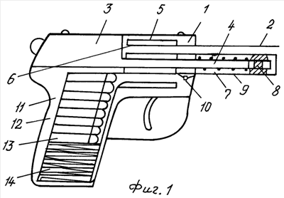 Пистолет содержит рамку 1 (фиг.1), ствол 2, свободный продольно-скользящий затвор 3, выполненный заодно с направляющим стержнем 4, на котором установлен с возможностью вращения барабан 5 с двумя гнездами для патронов, оснащенными фиксатором 6 патрона, и размещены возвратная пружина 7, стопор 8. Кожух 9 возвратной пружины удерживается на рамке подпружиненным фиксатором 10. В рукояти 11 установлена обойма 12 с патронами 13 и пружиной 14.