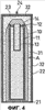 Затем, как показано на фиг. 3А, кольцеобразное пространство g заполняют гранулированным взрывчатым веществом из смеси аммиачной селитры и жидкого топлива, формируя первый слой 31 взрывчатого вещества. После заполнения взрывчатым веществом через отверстие цилиндра 22, как показано на фиг. 4, с верхним концом цилиндра 22 соединяют закрывающую пластину 23, например, из пластмассового или бумажного листа. На верхнюю поверхность закрывающей пластины 23 помещают листовое взрывчатое вещество (взрывчатое вещество SEP), формируя второй слой 32 взрывчатого вещества. Наконец, на центр закрывающей пластины 23 помещают детонатор 24 с электрозапалом.