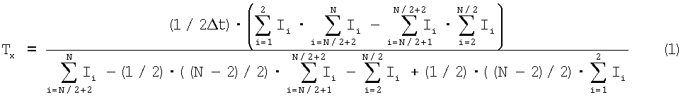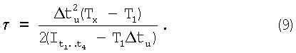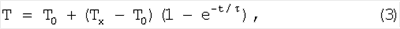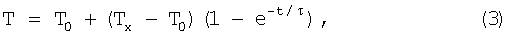 Формулы (1) и (2) получены следующим образом. Без ограничения общности найдем выражение для Тх, полагая, что N=8, с тем чтобы вывод формул можно было пояснять с помощью временной диаграммы на фиг.2. Если терморезистор имеет начальное значение температуры Т0 и находится в тепловом контакте с объектом измерения, имеющим температуру Tx, то текущее значение его температуры выражается соотношением: