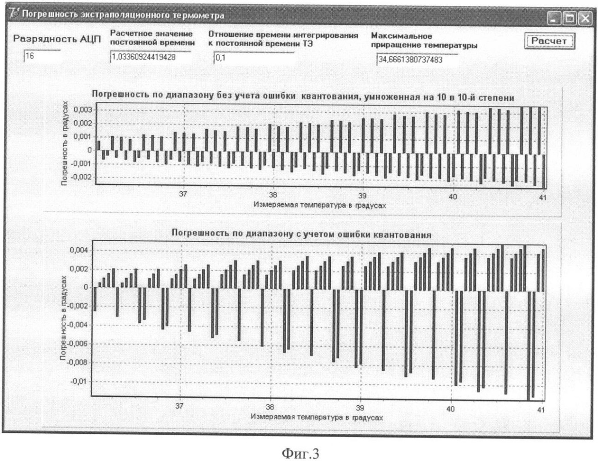 Для исследования процесса измерения температуры по предлагаемому способу программными средствами была создана имитационная модель термометра. Интерфейс программы представлен на фиг.3. Элементы интерфейса в верхней части окна программы позволяют устанавливать разрядность  -АЦП (в данном случае 16), значение отношения tu/ (в данном случае оно равно 0,1). Верхний график показывает столбчатую диаграмму зависимости абсолютной погрешности измерения температуры от значения измеряемой температуры в пределах от 36 до 41°С без учета погрешности квантования  -АЦП с шагом 0,05°С. Как видно, в этом случае погрешность имеет порядок 0,003×10-10, т.е. пренебрежимо мала, что свидетельствует о методической корректности предлагаемого способа измерения. На нижнем графике приведена диаграмма зависимости абсолютной погрешности от измеряемой температуры при учете погрешности квантования  -АЦП. Максимальное значение погрешности не превышает 0,011°С и имеет место при использовании 16-разрядного  -АЦП (известно, что такая точность далека от предельной точности, обеспечиваемой данного типа аналого-цифровыми преобразователями). При этом отношение tu/ равно 0,1, т.е. время измерения составляет величину порядка 0,2 . Если учесть, что при традиционном способе измерения время ожидания окончания переходного процесса установления температуры терморезистора составляет не менее 4 (это примерно соответствует разности значений температуры терморезистора и объекта измерения, равной 0, 1°С), то время измерения при использовании предлагаемого способа уменьшается в 20 раз.