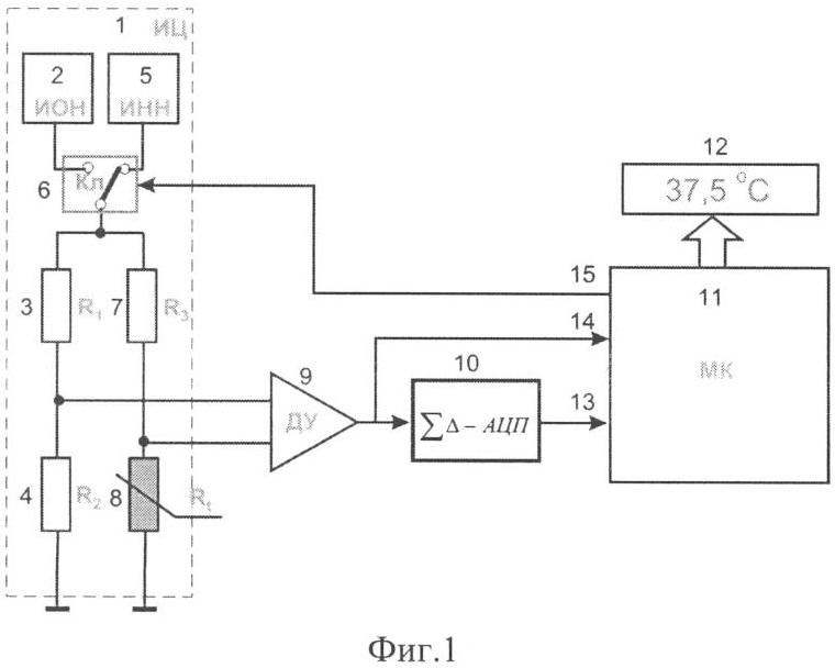 Функциональная схема (фиг.1) включает мостовую измерительную цепь 1 (ИЦ), состоящую из источника 2 опорного напряжения (ИОН), резисторов 3 (R1), 4 (R2), источника нагревающего напряжения 5 (ИНН), переключателя 6 (Кл) резистора 7 (R3) и терморезистора 8 (Rt), дифференциальный усилитель 9 (ДУ),  -АЦП 10, микроконтроллер 11 (МК) и отсчетное устройство 12, цифрами 13, 14, 15 обозначены соответственно кодовый вход микроконтроллера, вход компаратора микроконтроллера и шина управления микроконтроллера. Причем питающая диагональ измерительной цепи 1 подключена через переключатель 6 к выходам источников опорного 2 и нагревающего 5 напряжений, измерительная диагональ мостовой измерительной цепи 1 подключена ко входу дифференциального усилителя 9, выход которого подключен к входу  -АЦП 10, выход которого соединен с кодовым входом 13 микроконтроллера 11, вход 14 компаратора микроконтроллера подключен к выходу дифференциального усилителя 9, а управляющая шина 15 – к управляющему входу ключа 6.