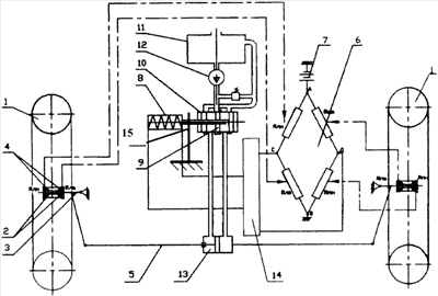 При отклонении схождения в ту или иную сторону управляемые колеса 1 за счет боковых реакций дороги будут воздействовать на втулки и, соответственно, на внутренние или наружные датчики 4 и изменять их электрическое сопротивление. При этом между точками С и Д моста 6 возникает напряжение, которое, пройдя через усилитель 14, подают импульсно на электромагнитную катушку 8, что вызовет в ней магнитный поток, который переместит сердечник электромагнитной катушки 8 и золотник 9 распределительного устройства 10 влево или вправо, обеспечивая подачу рабочей жидкости от насоса 12 в ту или иную полость гидроцилиндра 13 (реверсивного механизма), что вызовет изменение рабочей длины поперечной рулевой тяги 5, обеспечивая, таким образом, требуемое схождение колес 1.