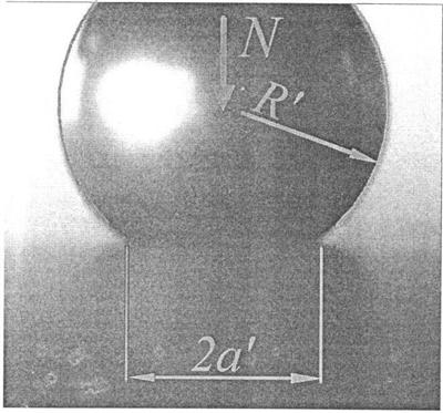 Эффективный приведенный модуль упругости характеризует упругие свойства индентора, покрытия и подложки в комплексе и используется для расчета контактного взаимодействия. Для его определения вначале проводят серию предварительных опытов по вдавливанию сферического индентора с радиусом R в плоский гладкий образец при разных значениях нормальной силы и определяют максимальную нормальную силу N0, которая не вызывает остаточных деформаций. Наличие или отсутствие остаточной деформации достаточно определить визуально как наличие или отсутствие лунки или трещин на поверхности. В основной серии опытов прикладывают силу N, которая меньше N0 Через заданное время после начала действия нагрузки N фотографируют сбоку индентор в контакте с образцом. Измеряют на фотографии размер изображения пятна контакта 2a’ и диаметр изображения сферического индентора 2R’. Это удобно делать в электронном виде с использованием программ векторной графики (см. чертеж). Определяют действительный радиус пятна контакта по формуле a=R·a’/R’ и вычисляют эффективный приведенный модуль упругости по формуле