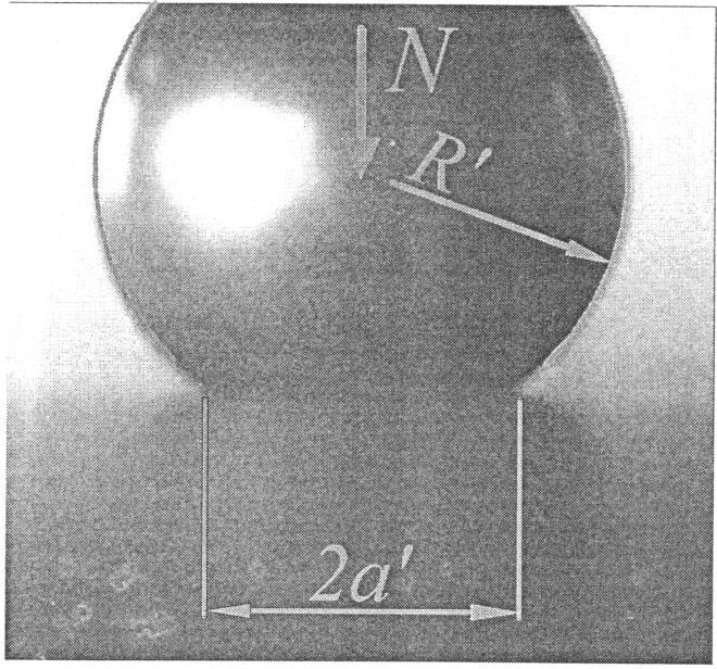 Предел текучести материала однородного образца или эффективный предел текучести Te слоеного образца при заданных значениях толщины слоев (данной толщине покрытия) необходимо знать для определения условий появления и развития пластических деформаций при контактном взаимодействии. Для его определения вначале проводят серию предварительных опытов по вдавливанию сферического индентора с радиусом R в плоский гладкий образец при разных значениях нормальной силы. В каждом опыте через заданное время после начала действия нагрузки N фотографируют сбоку индентор в контакте с образцом. Измеряют на фотографии размер изображения пятна контакта 2а’ и диаметр изображения сферического индентора 2R’. Это удобно делать в электронном виде с использованием программ векторной графики (см. чертеж). Определяют действительный радиус пятна контакта по формуле a=R·a’/R’ и вычисляют среднее контактное давление по формуле