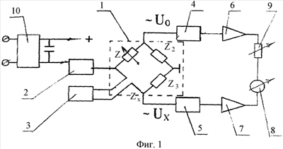 Известно устройство, предназначенное для измерения методом сравнения параметров электрических цепей (сопротивления, емкости, индуктивности и др.), содержащий измерительный мост (см. Н.Н.Евтихиев, Я.А.Купершмидт, В.Ф.Папуловский, В.Н.Скугоров. “Измерение электрических и неэлектрических величин”, М., Энергоатомиздат, 1990 г., стр.70-74).