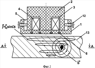 Устройство снабжено механизмом балансировки сигнала в виде трех винтов 12, расположенных в отверстиях корпуса 1 с резьбой вокруг ферритового сердечника через 120 градусов в плоскости, перпендикулярной оси корпуса. Устройство перемещается по изделию 13.