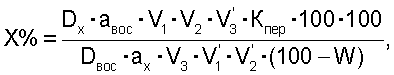 где Dx и Dвос – оптические плотности определяемого вещества и образца сравнения соответственно; ах и авос – точные навески определяемого вещества и образца сравнения соответственно; V1 и V2 – объемы приготовленного раствора определяемого вещества; V3 – объем аликвоты определяемого вещества; V’1 и V’2 – объемы приготовленного раствора образца сравнения; V’3 – объем аликвоты образца сравнения; 100 – коэффициент для пересчета в проценты; W – влажность, %; Кпер – коэффициент пересчета; коэффициент пересчета находят из выражения: