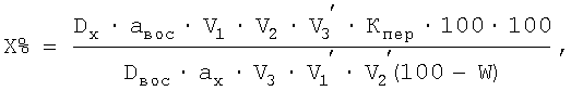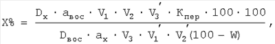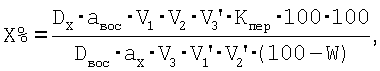 где Dx и Dвос – оптические плотности определяемого вещества и образца сравнения соответственно; ах и авос – точные навески определяемого вещества и образца сравнения соответственно; V1 и V2 – объемы приготовленного раствора определяемого вещества; V3 – объем аликвоты определяемого вещества; V’1 и V’2 – объемы приготовленного раствора образца сравнения; V’3 – объем аликвоты образца сравнения; 100 – коэффициент для пересчета в проценты; W – влажность, %; Кпер – коэффициент пересчета; коэффициент пересчета находят из выражения: