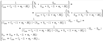 Аналогично емкости C1Г сопротивление R2 состоит из соединенных последовательно термонезависимого сопротивления R2H и термозависимого сопротивления R для компенсации мультипликативной температурной погрешности, а общее сопротивление определяется как R2=R2H+R . При этом величина термозависимого сопротивления R изменяется от температуры по зависимости R t=R ·(1+ · T), где R – начальное значение термозависимого сопротивления, т.е. величина сопротивления при нормальной температуре,  – температурный коэффициент сопротивления (ТКС) термозависимого сопротивления R , T – диапазон изменения температуры.